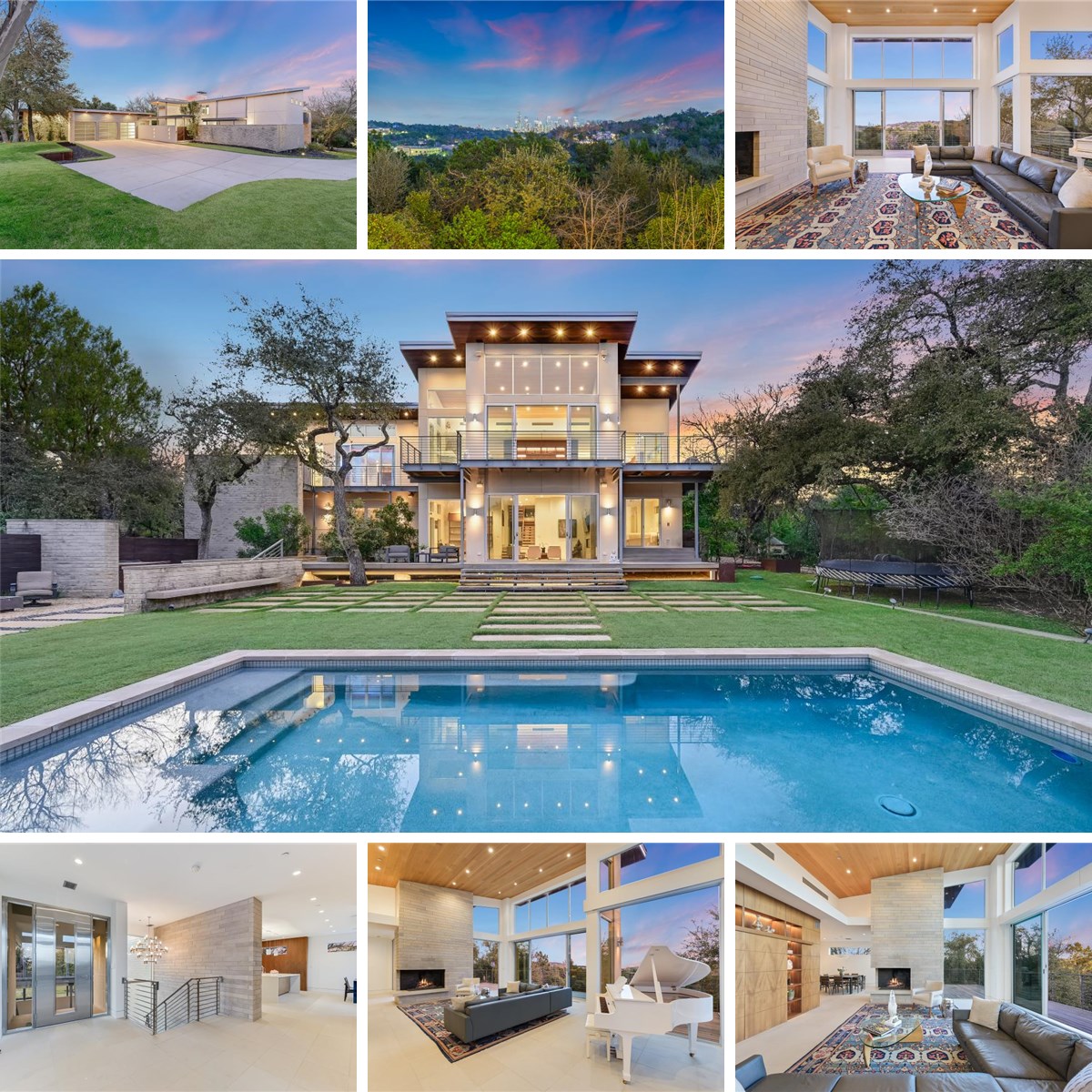 Designed with seamless indoor-outdoor integration, the home features walls of glass that frame panoramic views of downtown Austin and the beautiful grounds. A flexible floor plan caters to both privacy and entertainment, with full living spaces on each level, both surrounded by spacious outdoor living spaces. The upper floor boasts an open-concept living, dining, and kitchen area, a private study, and an expansive primary retreat. The lower level, opening to the lush lawn and resort-style pool, includes a guest suite with a kitchenette, living area, and a private home office/exercise room with a separate entrance, plus two additional bedrooms with ensuite baths. An oversize three-car garage also includes a private, climate controlled music/art studio further elevating the home’s offerings.